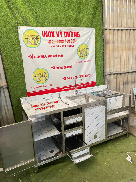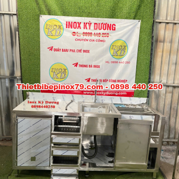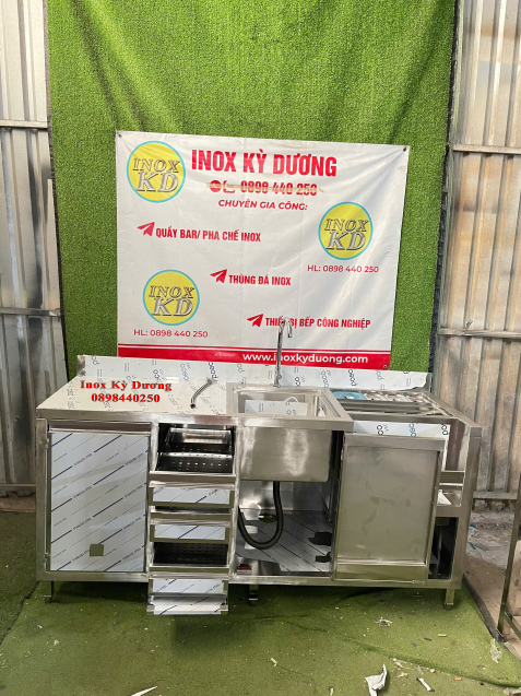 Quầy pha chế inox tích hợp được thiết kế hiện đại, tối ưu công năng trong không gian pha chế chuyên nghiệp. Sản phẩm kết hợp hoàn hảo giữa khu vực thao tác, chậu rửa, hệ thống ngăn kéo và khoang lưu trữ, giúp quy trình làm việc nhanh chóng – gọn gàng – hiệu quả.