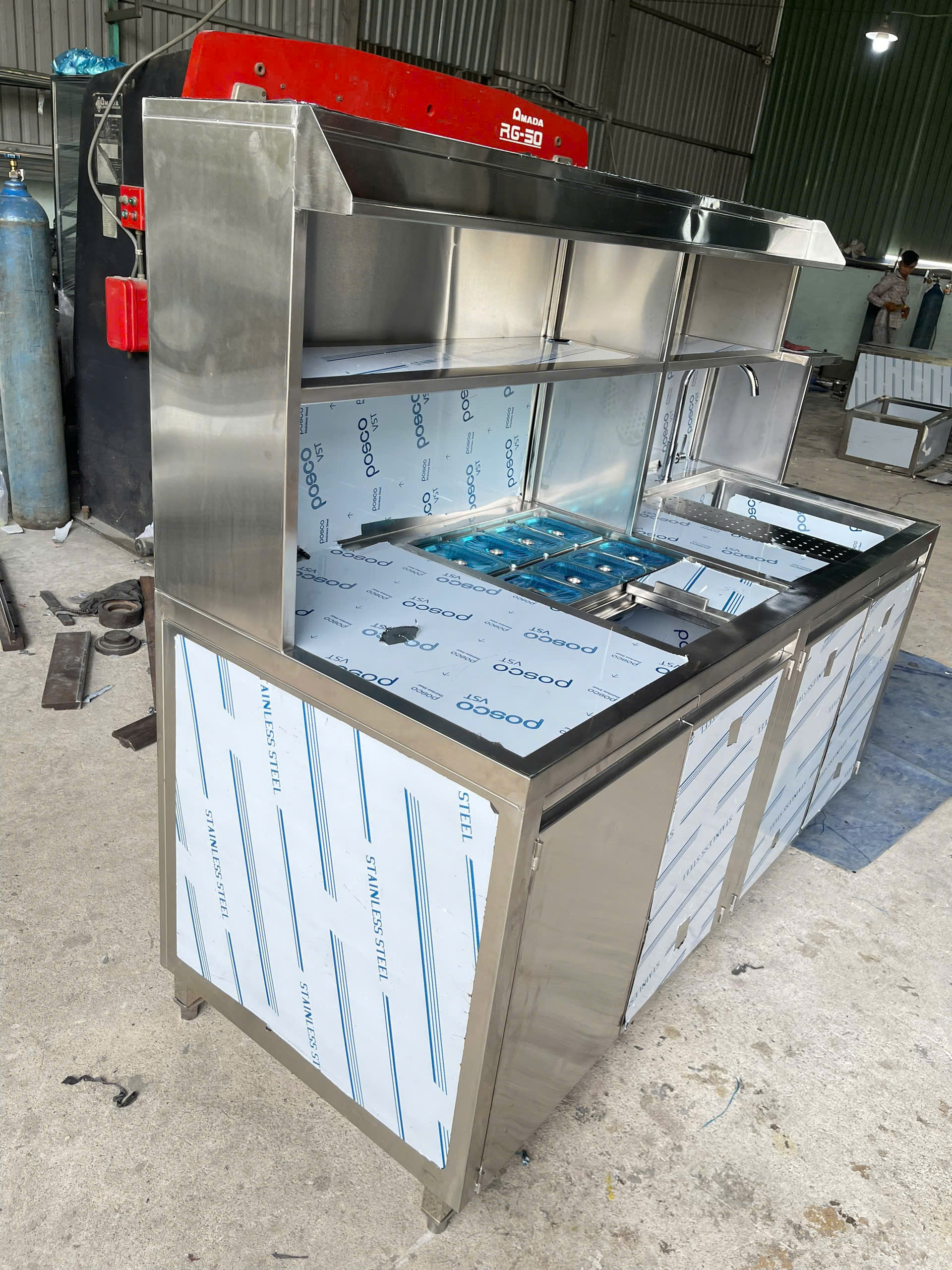 - Gia công: Tinh xảo mối hàn chắc chắn, được xử lý kỹ lưỡng, bo góc an toàn, hạn chế va chạm, chân quầy vững chắc, có thể điều chỉnh độ cao